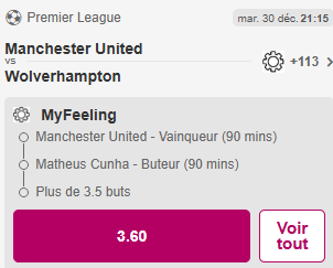 ➡️ Manchester United – Wolves : Matheus Cunha buteur @1.93