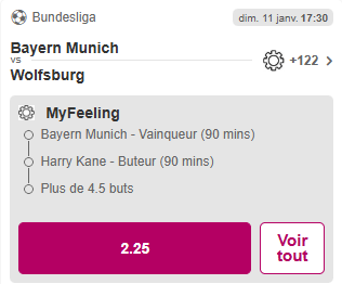 8e du championnat, le Borussia Mönchengladbach affiche une belle dynamique avec une seule défaite lors des 8 derniers matchs. Une victoire permettrait aux hommes de Gerardo Seoane de se rapprocher des places qualificatives pour la Ligue des champions. Cependant, ils auront fort à faire face au leader de la Bundesliga, le Bayern, qui a écrasé Leipzig avant la trêve (5-1). Ce match a marqué le retour de blessure de l’incontournable Harry Kane, désormais en pleine possession de ses moyens. Bien qu’il soit resté muet lors de son retour, tout porte à croire que l’attaquant anglais trouvera le chemin des filets dans cette rencontre.